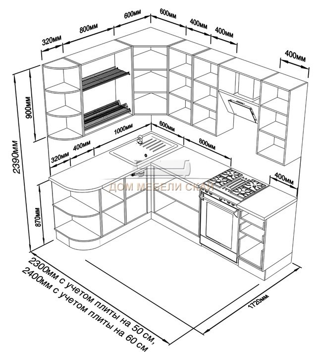 Ширина кухни с плитой на 50 см230 см